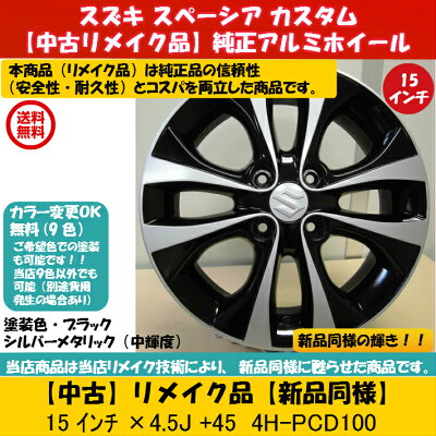 【中古 新品同様】【スズキ スペーシア 純正 中古 アルミホイール リメイク品】4本セット スズキ 純正 スペーシア 純正 ハスラー ワゴンR 軽自動車等 15×4.5J 100-4穴 +45 15インチ 中古ホイール 4本